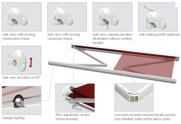 The Markilux 1650 is a strong semi-cassette folding arm awning with a steel twin-link chain operating feature, however this can be upgraded to a gas-piston operation. This retractable patio awning is similar to the Markilux 1600 but has integrated halogen lights in the front bar offering quality adjustable directional light.