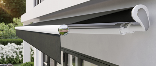 In almost playful fashion, the torque bar and fabric roller tube of the awning seem to fuse into one at the droplet-shaped roller tube support bracket.