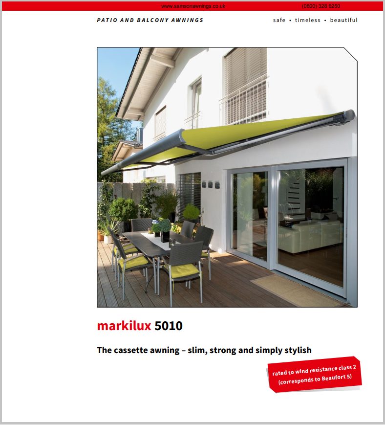The 5010 is a superb full cassette awning manufactured by world renowned high quality manufacturers Markilux. Accredited for its slender, stylish appearance, the Markilux 5010 leads the way as one of the strongest full cassette patio awnings on the UK market at present.