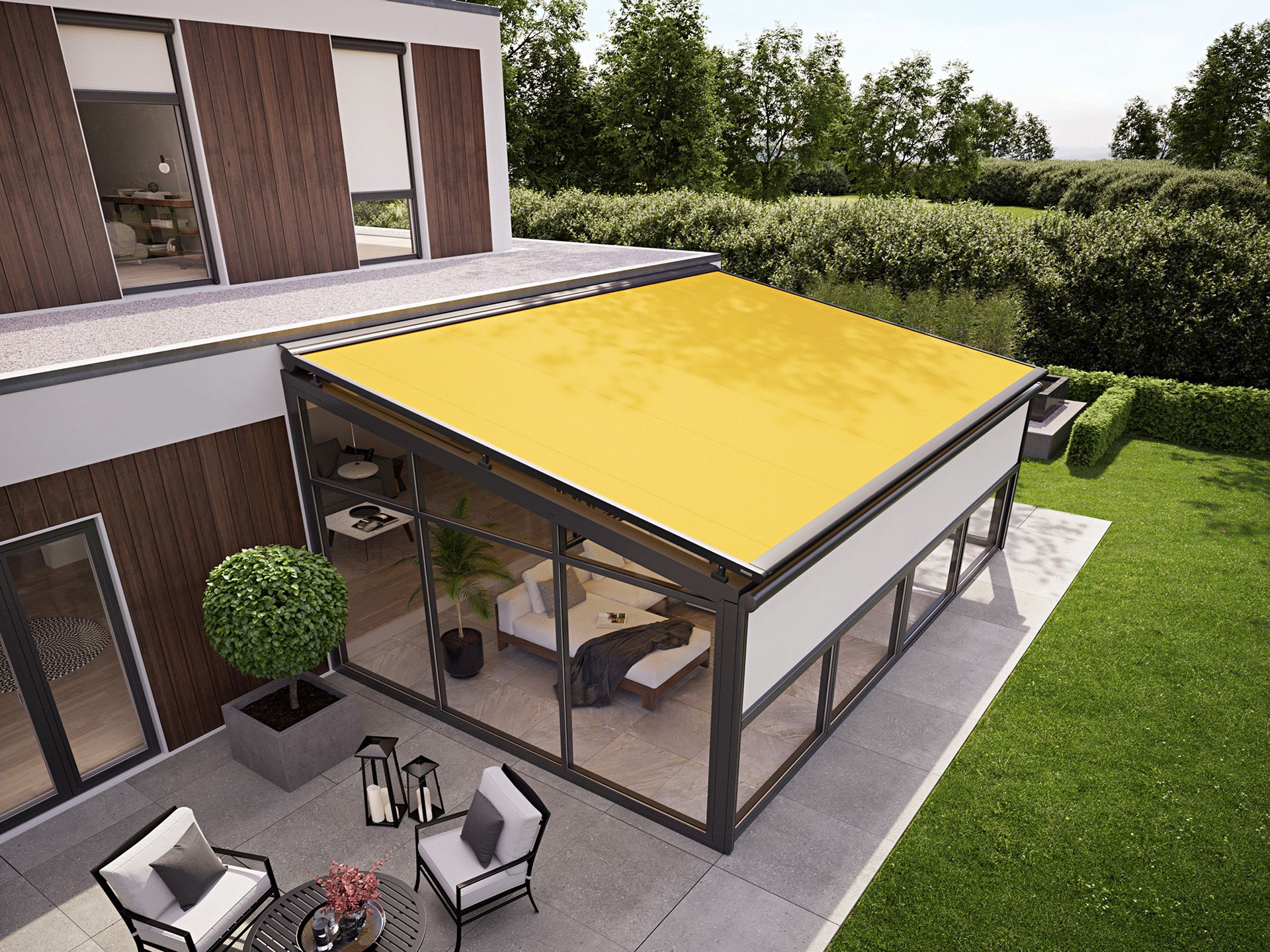 With a markilux above-glass awning, your conservatory or glass canopy remains a cool and inviting space—even under intense sunlight. The awning fabric blocks the sun’s rays before they reach the glass roof, preventing glare and heat buildup inside.