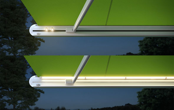A brilliant lighting source that converts the room under the awning into an oasis of well-being in the evening.