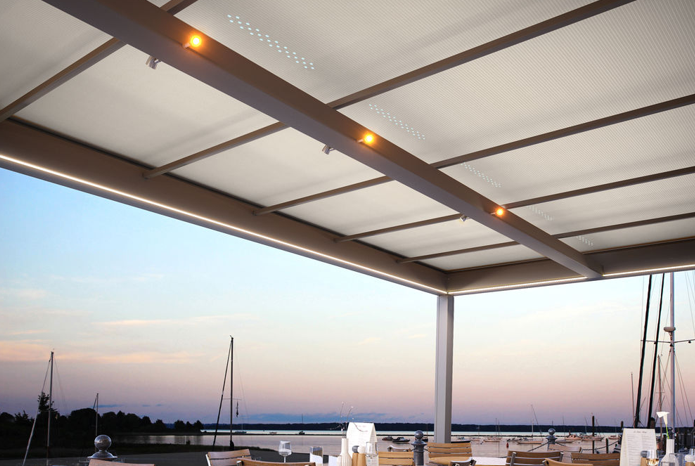 The same principle applies here with a retractable electric pergola fabric roof system, but the lourved roof system is triple layered and 100% waterproof and very strong. The framework in which the fabric works within is also larger and incorporates rainwater guttering into the front profile.