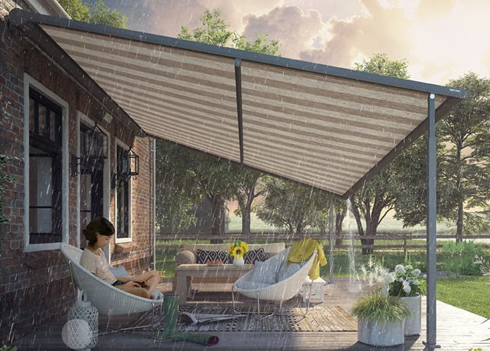 Introduced in around 2010 to the UK, the simple principle of a retracting fabric cover on a light aluminium framework which extends and retracts as required, but can also have a drop down front fabric valance for light breezes and retractable side awnings on one or both sides.