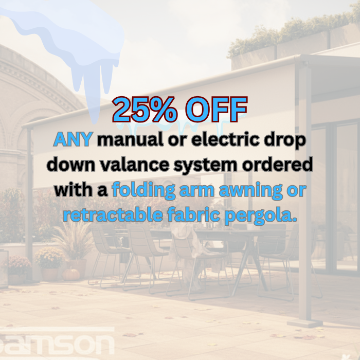 Winter Sale unbeatable offer with 25% off the price of the manual or electric drop down valance system for any of our Weinor or Lewens retractable folding arm awnings or retractable pergola systems.