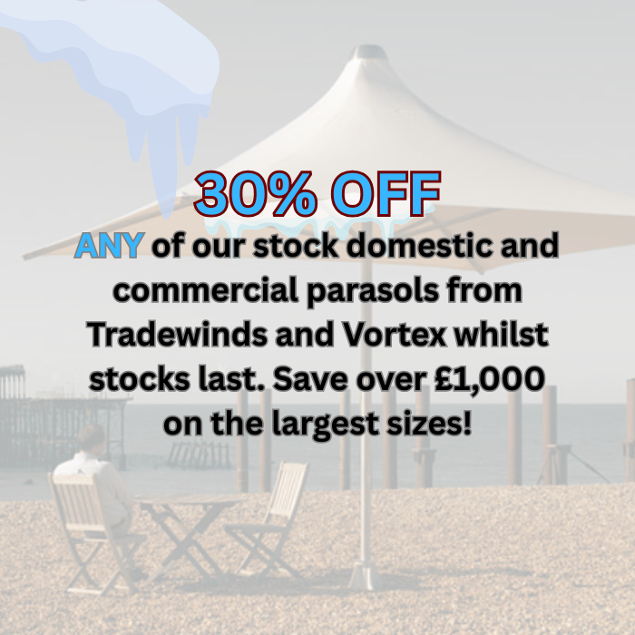 Extra discounts on a wide range of parasols between 2m square and 6m hexagonal in a wide range of colours and fabric choices.