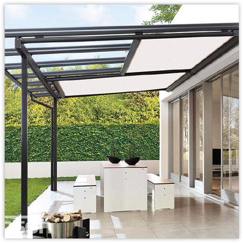 Right now save 15% off this German manufactured ‘combo’ of a bespoke glass veranda roof with aluminium frame and an electric retractable fabric blind built into the back section of the roof and almost invisible when not in use.