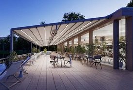 Products include bespoke awnings, pergola systems, verandas, large umbrellas and glass rooms.