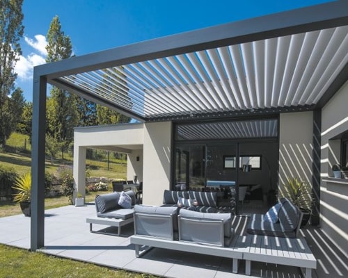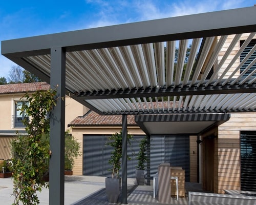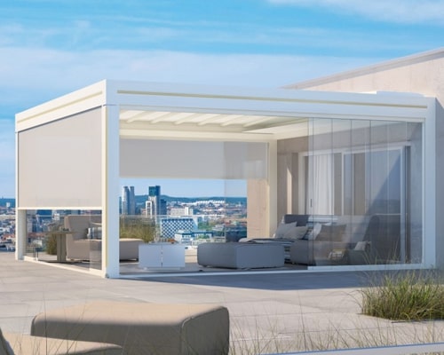The bioclimatic outdoor room is a flat roof design with a slight pitch in the louvre blades used to provide water drainage into the integrated guttering which is on all 4 sides of the structure (3 on a lean to system). The louvre blade roof system offers all year round protection and at the push of a button allows air movement and sunlight in but with control on the amount by the aluminium blades which rotate up to a full 170 degrees from their closed position.