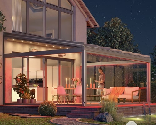 With the sides closed in using any of the options available you have an outdoor room providing all year round protection from sun, wind and rain. Vertical blinds, sliding glass doors are popular but other infills are also possible. LED lights integrated into the roof or the perimeter provide use into the night and various forms of heaters provide warmth on the cooler months.