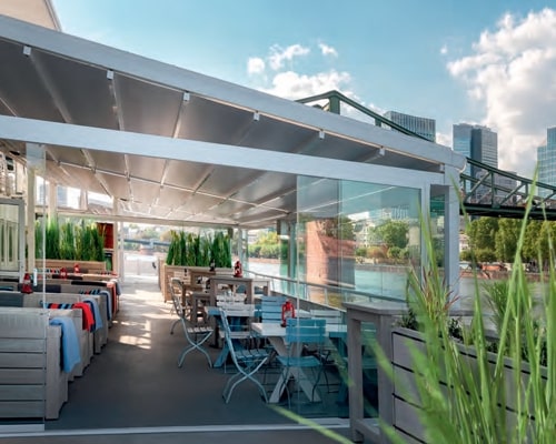 The super tough layered fabric is extended and retracted at the push of a button and set at an angle inside the aluminium framework structure and facade to ensure proper rainwater dispersal. Rainwater is collected by a guttering system in the front profile and sent down through the support posts to low level exits. The fabric is further supported and strengthened by a number of aluminium struts going across the width to provide the support for heavy rain and light snow. These same horizontal struts can have LED lights integrated or the lights can be in the perimeter of the system.