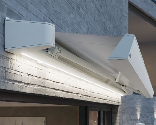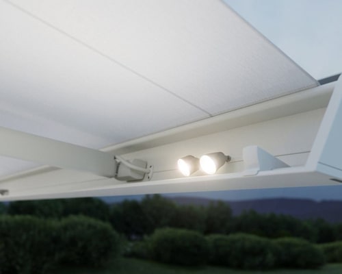 The lights are usually dimmable from the hand transmitter, and we offer several models now with either lights in the underside of the awning cassette, underneath the awning arms or in the front profile. It is also possible to buy ‘light bars’ and ‘light boxes’ as an additional item to an existing awning or pergola system.