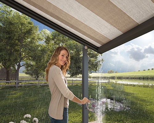 This is an all round contentious subject as most manufacturers will default state that folding arm awnings are not to be used in rainfall, but this is normally referring to heavy rain, which is difficult to define in a real world. Common sense should be key to managing a folding arm awning.
