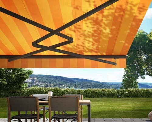 Sometimes an awning will require a projection out from the wall which is greater than the width for effective shading or when fitting in a tight space. We offer retractable awnings that achieve this by the supporting arms crossing over each other when closed. Several options are available in manual or electric operation. This is a limited range of only a couple of awning models, but they are being used more frequently and the installation against the structure requires a larger space than most other awnings.