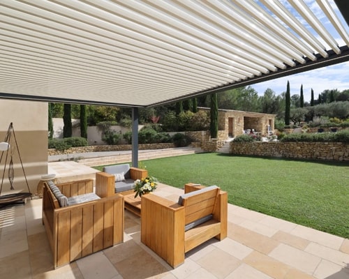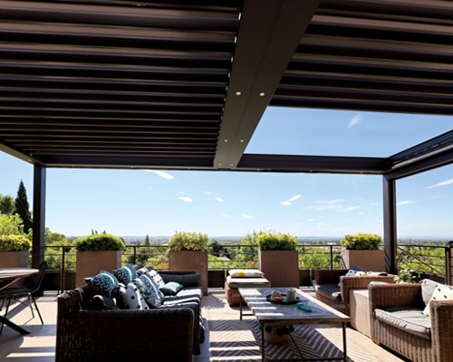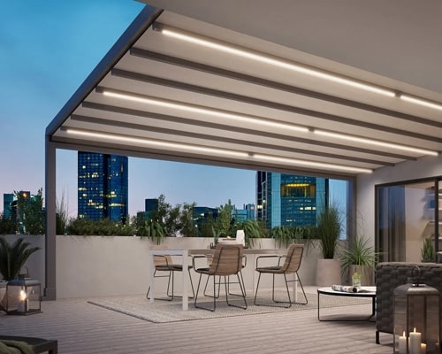 LED lights integrated into the roof, or the perimeter provide use into the night and various forms of heaters provide warmth in the cooler months. Bear in mind that with a louvre bladed roof you will close all the blades in rain, and this will give a total blackout roof, so lighting is far more important than with our fabric roof systems where light still comes through.