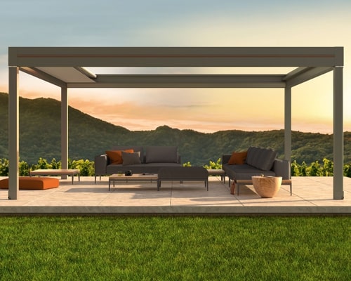 The bioclimatic louvre bladed pergola is a flat roof principal with a slight pitch in the louvre blades used to provide water drainage into the integrated guttering which is on all 4 sides of the structure (3 on a lean to system). The louvre roof system offers all year round protection and at the push of a button allows air movement and sunlight in but with control on the amount by the aluminium blades which rotate up to a full 135 degrees from their closed position.