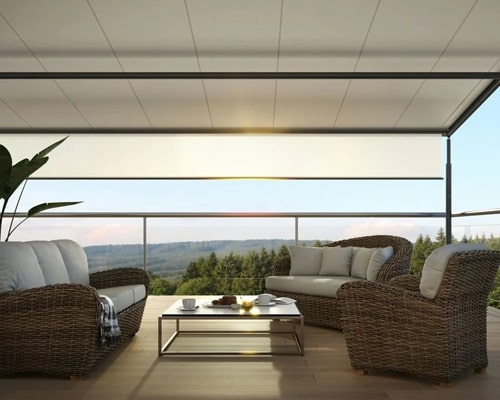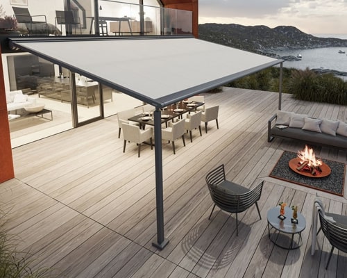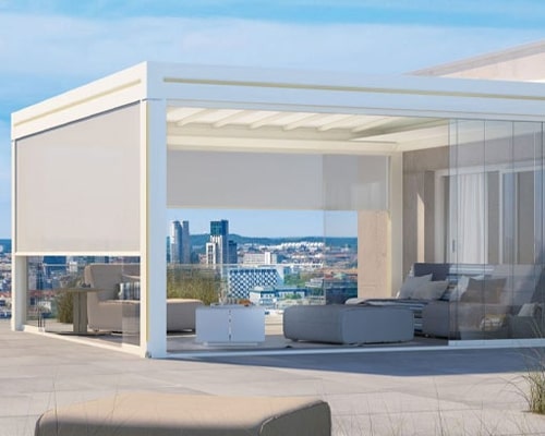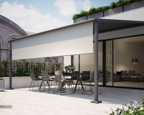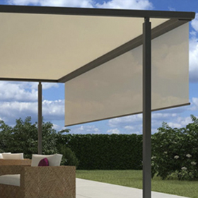 Our range of modular pergola systems allow the addition of integrated side elements at any stage after the initial pergola is installed to further enhance weather protection. The aluminium framework for the system is capable of having many different products added to the front and sides for wind and rain protection to one or all exposed apertures.