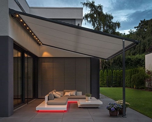 Our range of retractable fabric pergolas are wall mounted, front leg supported systems with the fabric cover pulled taught by a pulley and tension system in the sidetracks. The systems are capable of use in higher winds and rain than a normal self-supporting awning and can have greater projections as there are no hinged arms used in the mechanism.