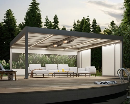 LED lighting and infra-red heating is commonly included, and the sides are more often infilled to provide as near to complete enclosure from the elements as possible but with the beauty of a retractable roof.