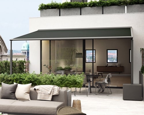 Made to measure and with a choice of over 200 fabrics and over 60 frame colours this is a great system for sunshade and rain protection for larger patio areas, or where there is an issue with fixings and structural support on a single storey building.