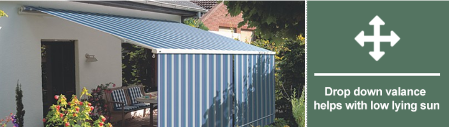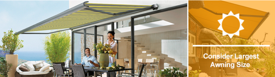 Consider the size requirements carefully and always try for the largest awning size possible when specifying for people sitting underneath. For shading a room or window the pitch may need to be greater than envisaged and a further projection required depending on the direction the room faces in relation to the sun. Also, for covering people sitting underneath the projection may need to be considerable and therefore the height at the back may need to be higher than envisaged and not always possible with a single storey building/extension without additional bracketry.