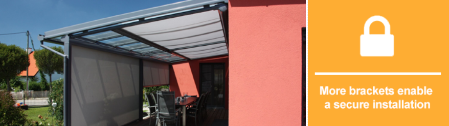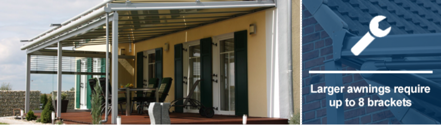 Are there any issues with where the wall brackets are to be fitted? Bear in mind some awnings are only manufactured with end fixed brackets and others have some flexibility in their positioning. Larger awnings will require more than two brackets and sometimes up to eight brackets on some 14 metre wide awnings. These brackets may not be able to be positioned where there is an existing door or window aperture so check before committing. There is always a way round the problem however, with additional and extended brackets going horizontally or vertically.