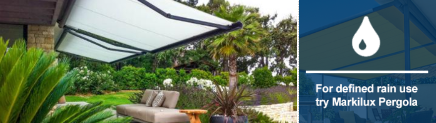 For an awning that will be used in the rain, certain self supported awning models are definitely stronger and more suited. A key aspect is to have a minimum 14 degree pitch on the fabric cover (and ideally 20 degrees) which inevitably can mean quite a high fixing position for the awning cassette at the rear. This can be an issue with single storey buildings/extensions.Heavy bursts of rain may cause an issue with any fabric cover canopy, even with a reasonably steep pitch, and obviously stormy weather can also bring sudden high winds, which are a greater issue to self supporting fabric awnings. We do offer an awning with a manual winding mechanism to adjust the pitch as required on the fly.For defined rain use it might be better to look at the supported systems such as the Markilux Pergola or a fixed glass or polycarbonate roof canopy with an additional retractable fabric awning for sun protection when required.For more information on what systems are suitable for different weather conditions, click here.