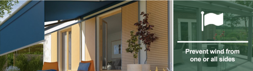 Wind is the biggest enemy of self supported fabric awnings and if wind is a large factor in the proposed area then definitely consider the stronger, supported Pergola type systems, fixed glass or polycarbonate canopies or similar systems with a retractable vinyl or louvred aluminium roof and support from all sides. Many of these systems can have additional side protection products such as vertical blinds or frameless sliding glass doors. which also help deal with windier conditions.Do consider that the speed of wind at which an awning retracts is normally at the point where sitting outside is not comfortable, so the main issue is usually with larger commercial applications where weather protection needs to be more assured most of the year round.A wide range of products also help to combat wind such as pull out retractable side screens, vertical fabric blinds, adjustable louvred aluminium fencing and vertically rising glass balustrades. We can provide many products to prevent wind from one or all sides of any of the structures we sell.
