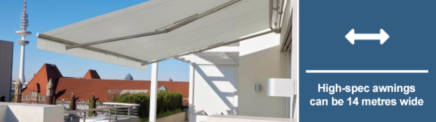 Many higher specification awnings can be manufactured up to just under 14 metres wide, and the maximum projection for a self- supporting awning is four metres. Any larger than this and you have to start looking at systems with front supports and a framework in which the fabric is guided in for additional support.