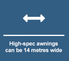 Many higher specification awnings can be manufactured up to just under 14 metres wide, and the maximum projection for a self- supporting awning is four metres. Any larger than this and you have to start looking at systems with front supports and a framework in which the fabric is guided in for additional support.