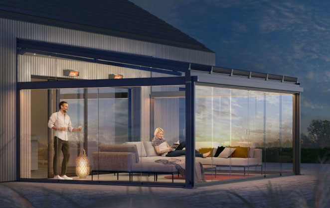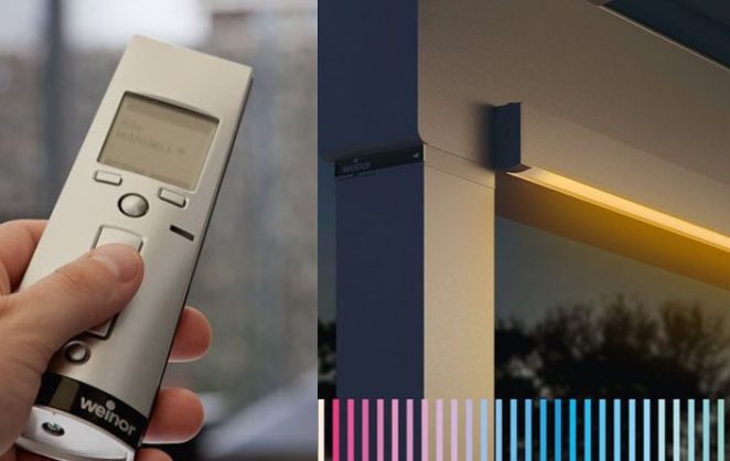 The Weinor Terrazza Sempra is available with motor drive electric operation for all vertical blinds, sun awnings, lighting and heating for central control of all components and maximum ease of use.