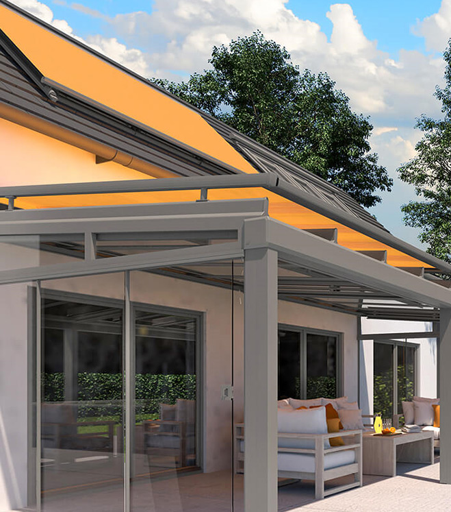Our extensive range of permanent Terrace & Patio Covers are the ideal solution to all year round weather protection for both domestic and commercial environments. With their unique adaptability, our solid structure canopies can be installed almost anywhere and everywhere. No product demonstrates this more than our Samson Piazza or Weinor Terrazza Patio Cover System using either polycarbonate or glass for the roof cover and high quality aluminium sections for the main structure available in many finished low maintenance colours to compliment your home. All these systems have rainwater guttering as standard and for most it is cleverly designed into the front profile support section and directed down the front support posts and away from the area covered.