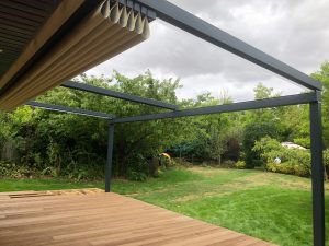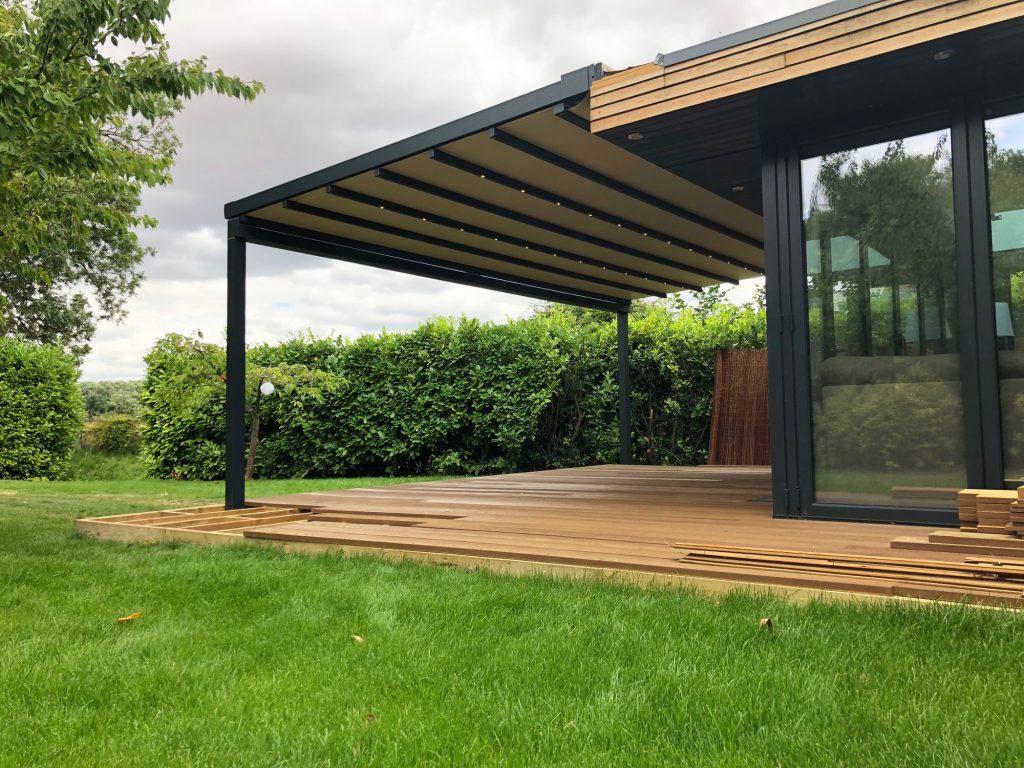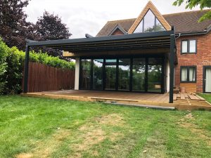 This fantastic looking property was having the garden revamped, and part of this was having decking laid down. To go over this, the owners wanted a retractable roof system to enable them to spend time outside during the summer even when it rains, but the ability to open it up during nicer weather.