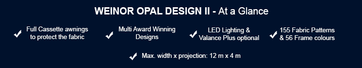 The Opal Design II is available with a large selection of fabrics from the Weinor range – contact us for more information.