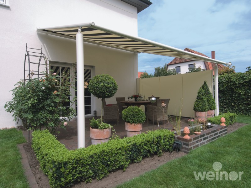 Here, our tried-and-tested WGM 2030 conservatory awning, which has built a reputation for mastering areas that pose special difficulties, is mounted at the front on sturdy posts fitted to weinors Terrazza patio roof. This solution also enables us to reduce significantly the amount of stress acting on the installation points on the wall-an alternative that works in numerous cases.