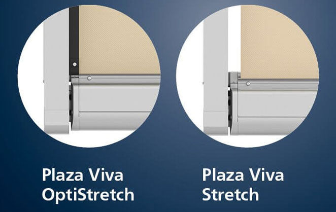 With Plaza Viva OptiStretch the fabric is held captive and on all four sides. The advantages: a highly tensioned fabric and no light gap on the sides. The basic version of the Plaza Viva Stretch is tensioned on two sides and there is a light gap between the fabric and guide channel