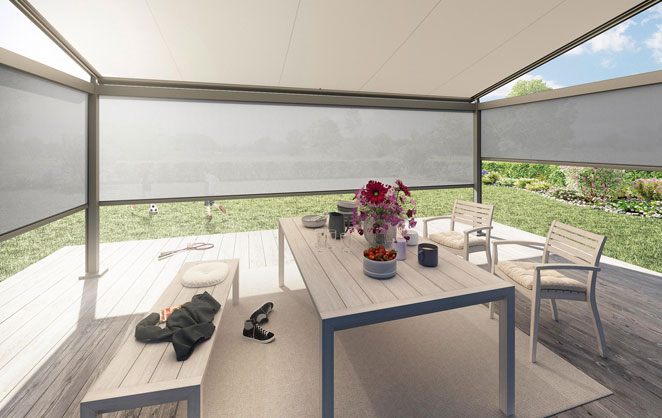 This clever combination with the VertiTex II vertical awning promises all-round reliable sun protection, privacy, wind screen and anti-glare protection under your Plaza Viva.